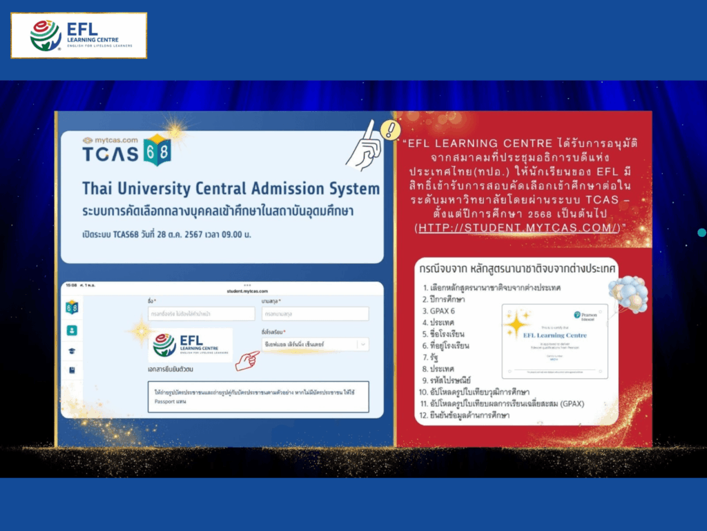 โดยในโอกาสฉลองครบรอบ 20 ปี ของ EFL Learning Centre ในปี 2024 ดร. วิไลวรรณ วรรณโชติผาเวช ผู้บริหาร EFL Learning Centre ได้รายงานถึงความก้าวหน้าของโรงเรียนในปีนี้ว่า “EFL Learning Centre ได้รับรองจาก สมาคมที่ประชุมอธิการบดีแห่งประเทศไทย (ทปอ.) ในการอนุมัติให้นักเรียนของ EFL Learning Centre สามารถสมัครสอบคัดเลือกเข้าศึกษาต่อในมหาวิทยาลัยในระบบ TCAS ตั้งแต่ปี 2568 เป็นต้นไป”