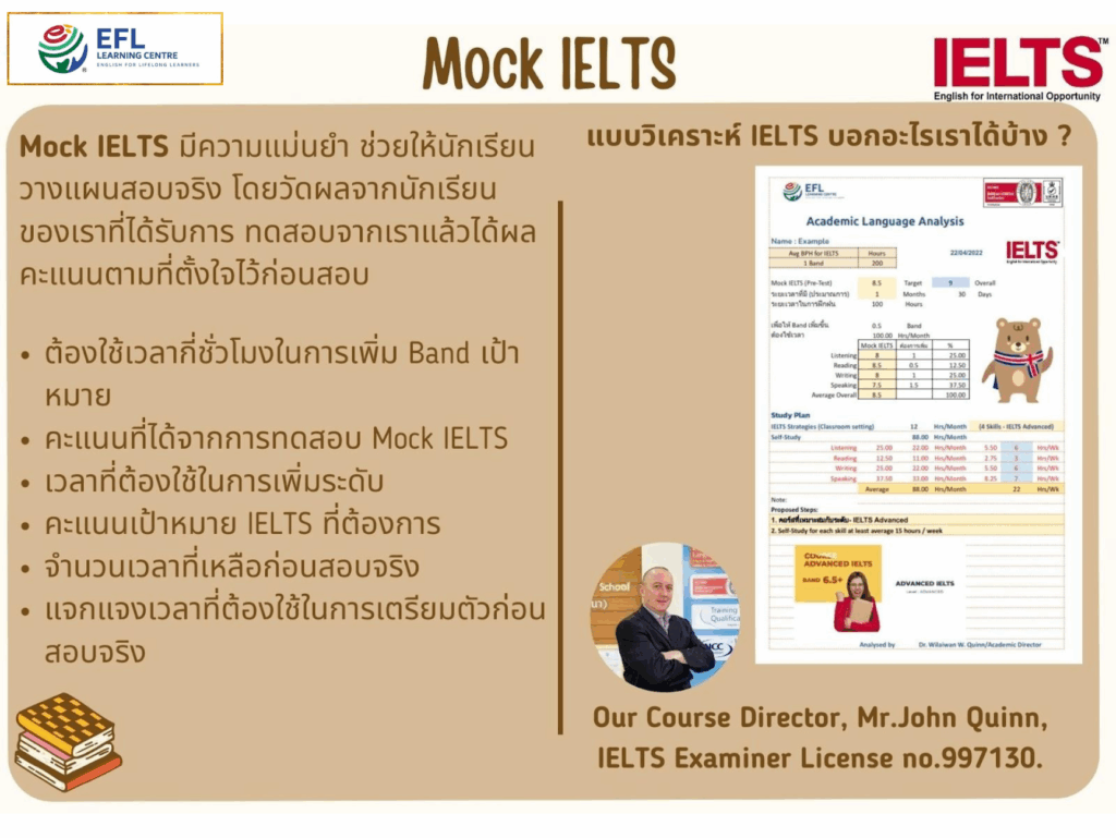 EFL Learning Centre ไม่ได้มีแค่การติว แต่เรามีหลักฐานความสำเร็จของนักเรียนที่พิชิต Band 7, 7.5, 8+ อย่างต่อเนื่อง รวมถึงริเริ่มภารกิจมอบทุนการศึกษา Mission Possible: IELTS Band 9 เพื่อปั้นเด็กไทยให้ความ IELTS band 9 ได้จริง สถาบันของเราผ่านการรับรองคุณภาพระบบการสอนระดับสากล (ISO 9001 / TQUK) สร้างความมั่นใจได้อย่างแน่นอนว่าเนื้อหาและกระบวนการเรียนสอดคล้องมาตรฐาน รวมถึงครูผู้สอนผ่านการรับรองด้านการสอนภาษาอังกฤษ พร้อมทีมวิชาการที่ที่มี Former IELTS Examiner จาก University of Cambridge ESOL อยู่ด้วย และที่สำคัญไม่แพ้กันคือเรามี Mock IELTS Exam จำลองข้อสอบครบทุกพาร์ท พร้อมส่งเสริมผู้เรียนให้ไปถึงคะแนนที่ต้องการได้จริง