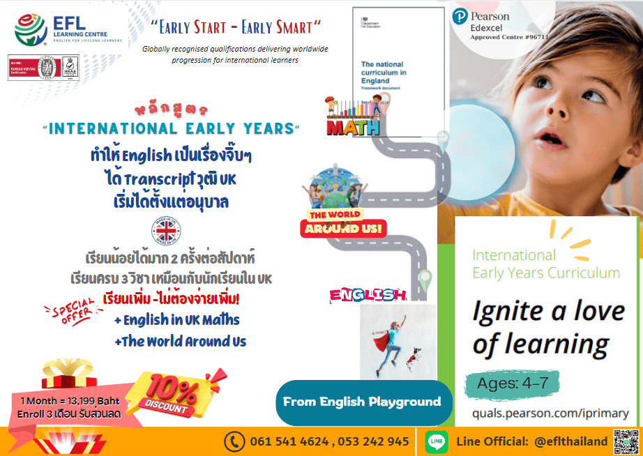 EFL Learning Centre ขอเสนอทางเลือกทางการศึกษาของน้องๆ ที่เรียนโรงเรียนไทยธรรมดา แต่เสาร์-อาทิตย์ หรือช่วงปิดเทอม คุณพ่อคุณแม่สามารถพาน้องมาเรียนต่อยอดด้วย “หลักสูตร International Early Years” ซึ่งเป็นส่วนหนึ่งของ ระบบการศึกษาในประเทศอังกฤษ (Pearson Edexcel) โดยการจัดการเรียนการสอนเป็นแบบตามอัธยาศัย (Non-Formal) ไม่ต้องเร่ง ไม่ต้องรีบ ตามศักยภาพของน้องจริงๆ เรียนสัปดาห์ละ 2 ครั้ง ผลคะแนน PISA ของหลักสูตรการศึกษาประเทศอังกฤษอยู่ในกลุ่ม Top 20 ของโลก การสอบ PISA ของ OECD ในปี 2022